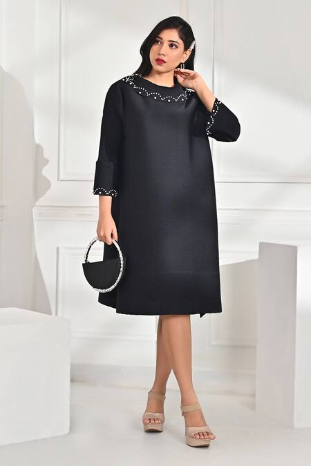 Black turtle neck midi dress featuring pearl work along the neckline and bell sleeves
