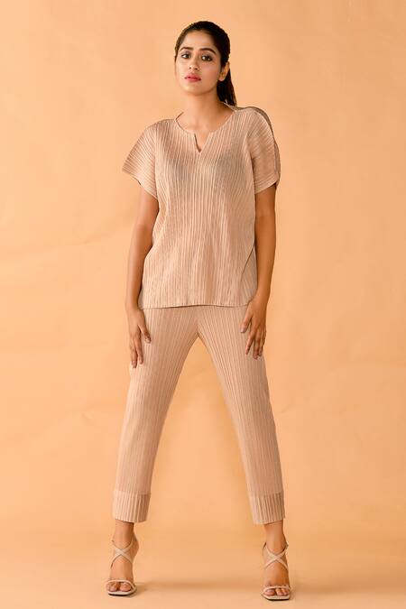 Buy_Crimp_Beige Polyester Embroidery Open Neck Vertical Pleated Top And Pant Set_at_Aza_Fashions