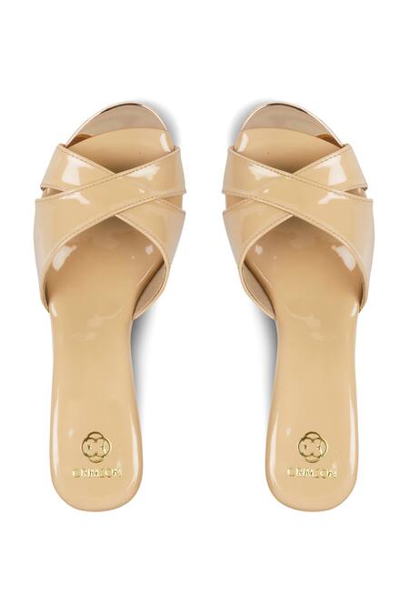 Beige faux leather wedges featuring criss cross strap detailing