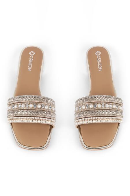 Gold flats featuring embellished straps with beads, pearls, and crystals