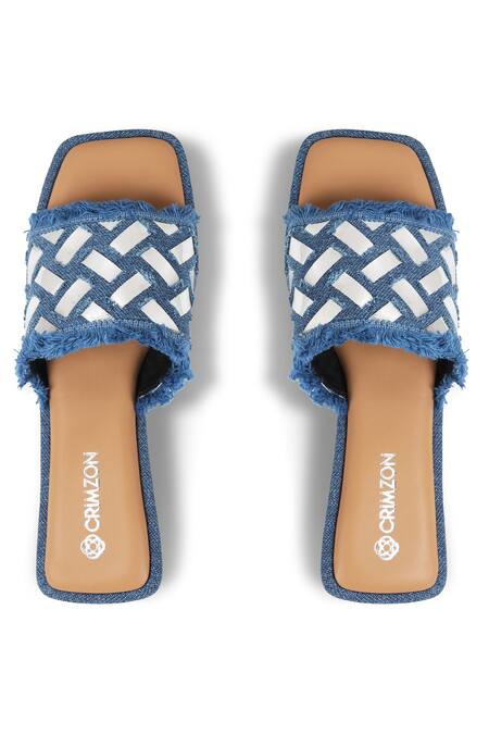 Blue denim flats featuring a square toe front and fringe detailing