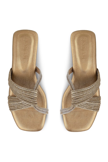 Gold flats featuring textured glitter interwoven straps and a slip-on closure