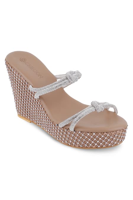Silver wedges featuring dual straps adorned with Swarovski embellishments