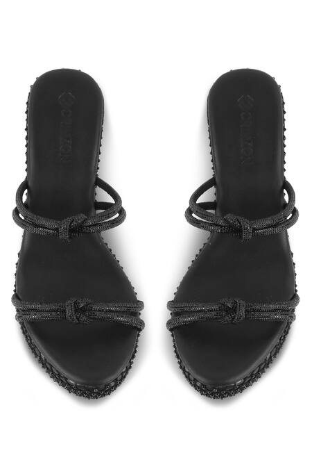 Black wedges featuring dual straps and Swarovski embellishments