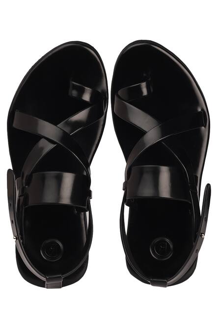 Black leather sandals with criss-cross straps, toe-ring & ankle back strap.