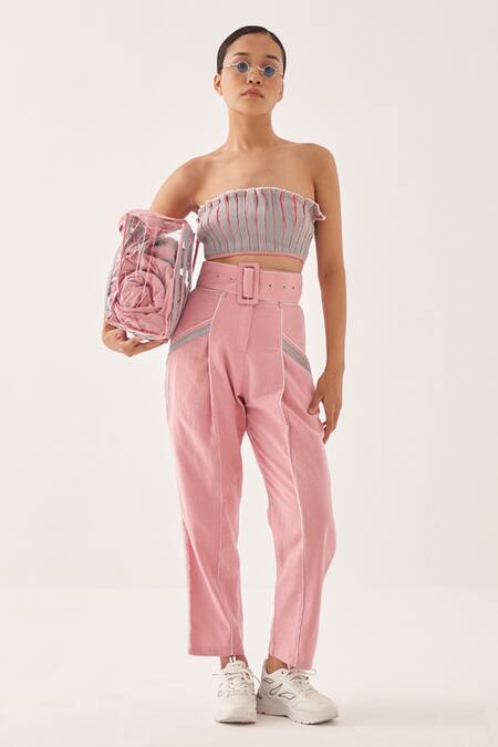 Bubblegum pink cotton linen box-pleated bustier featuring grey contrast taping and white piping detailing. Paired with matching pants and a self-buckle wide belt.