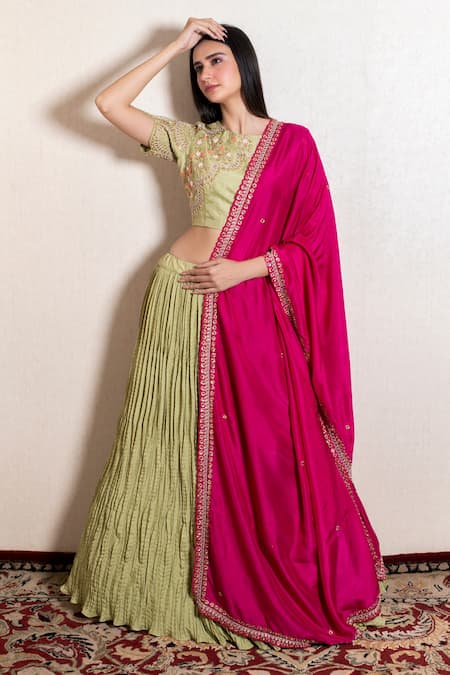 Pista green lehenga featuring crushed detailing and scallop bordered sleeves. Paired with a blouse adorned with floral and thread embroidery, complemented by a contrasting pink dupatta.