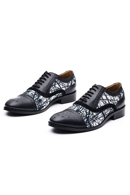 Black brogue shoes featured on crease-free abstract printed canvas.