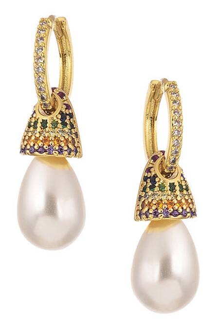 Gold toned hoops embellished with crystals on one side and detachable pearl drop.