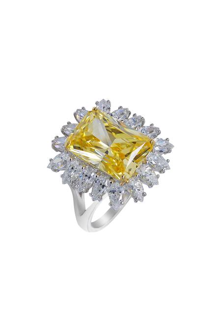 Silver toned ring featuring a rectangular yellow stone center embellished with zircon crystals