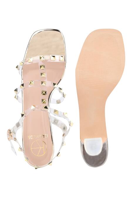 Gold transparent strap heels featuring pyramid shaped studs and a square front toe