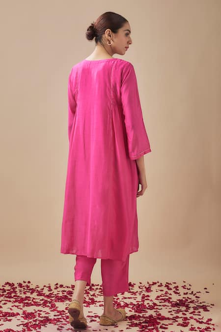 Pink silk cotton kurta featuring a V neckline and three quarter sleeves with sequin and pleat detailed yoke. Paired with matching relaxed fit pants.