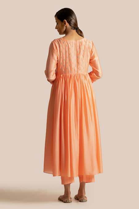 Orange silk cotton flared anarkali featuring pita and resham embroidered yoke. Paired with matching pants for a complete look.