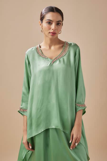 Sage green asymmetric hem tunic featuring full sleeves and placement zardozi embroidery. Paired with a draped skirt for a cohesive look.