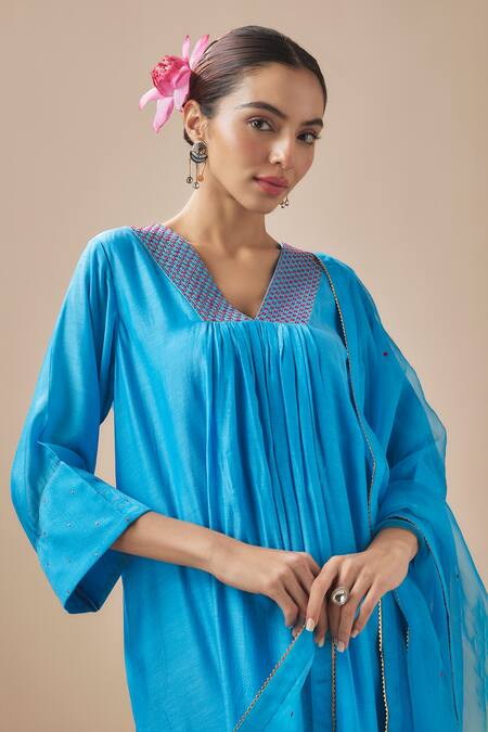 Cyan blue A-line kurta featuring pleat detailing and embroidered yoke with aari and resham work. Paired with matching pant and dupatta for a complete look.