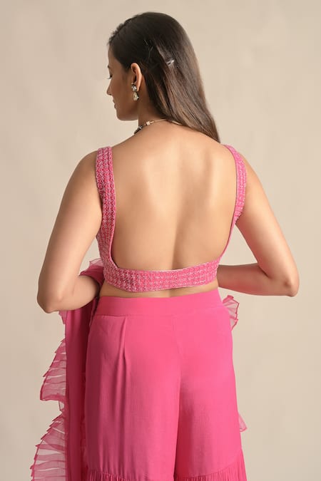 Pink pre-draped pant saree featuring ruffle detailing and a separate drape. Accompanied by a hand-embroidered padded blouse with resham and cutdana work.