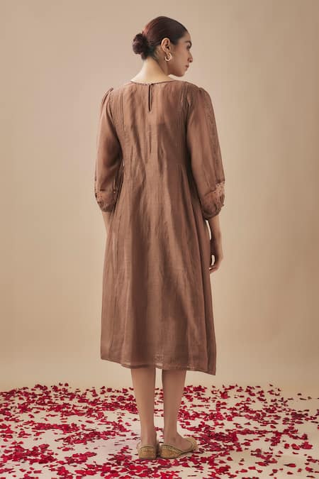 Brown midi dress featuring pintucks on the side and lace & sequin embellishments on the neckline. Includes an inner lining for added comfort.