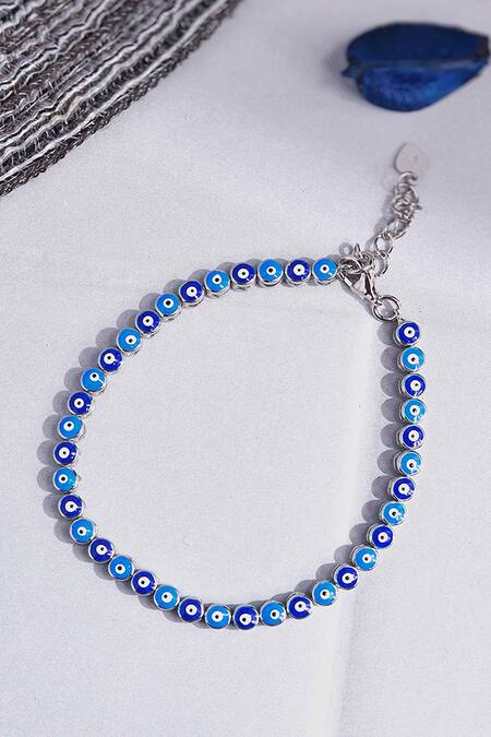 925 silver bracelet featuring circular cut work and blue evil eye enamel details