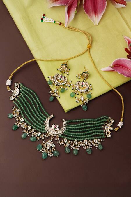 Distinctive crescent motif on the choker, Intricate detailing with green stones and pearls, Handcrafted design with cultural inspiration