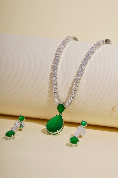 Emerald stone drop center motif on necklace, Clear faux diamond side patterns, Matching earrings with emerald accents