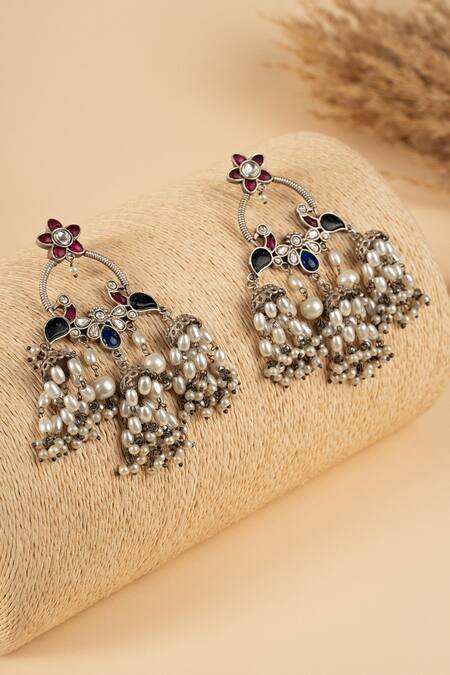Silver plated Empress trio dangler oxidized jhumki earrings featuring faux pearl and stone embellishments