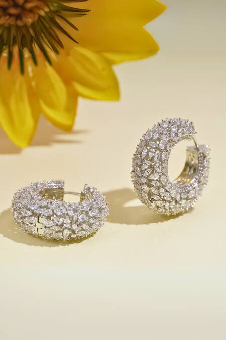 Silver tone frosted hoop earrings featuring a clear faux diamond studded textured cluster pattern