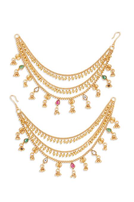 Gold toned ear chains featuring ghungroo embellishments and symphony shaped design. Set includes two pieces with colorful accents.