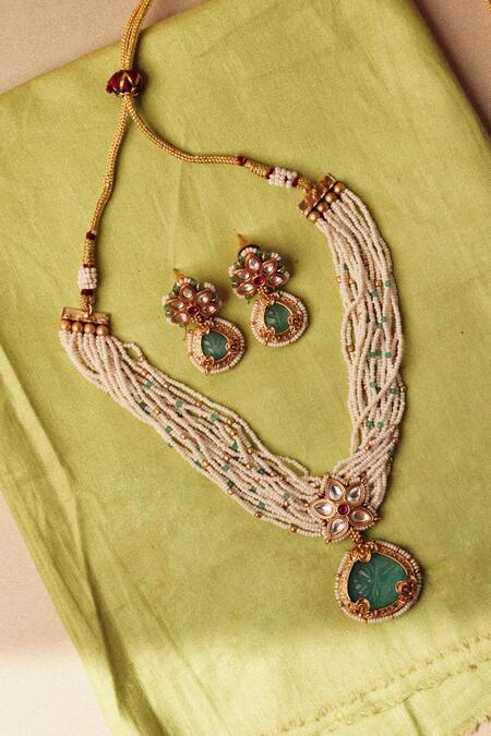 White choker necklace featuring a radiant jade pendant, delicate pearls, and gold-plated detailing. Accompanied by matching earrings adorned with jade and intricate embellishments.