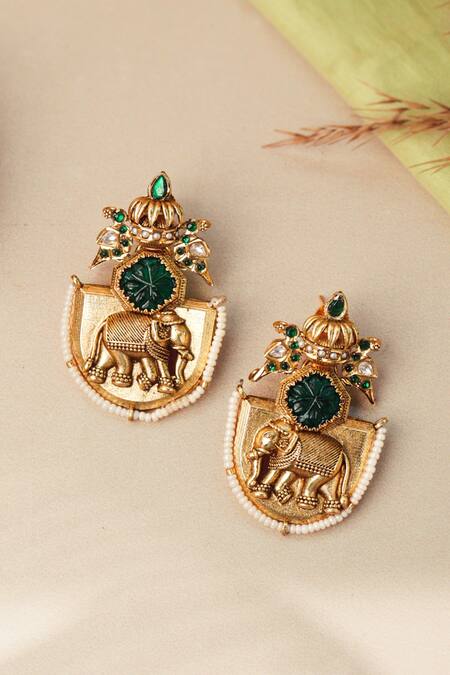 Intricately carved elephant motif, Emerald green stone embellishments, 22 kt gold plating