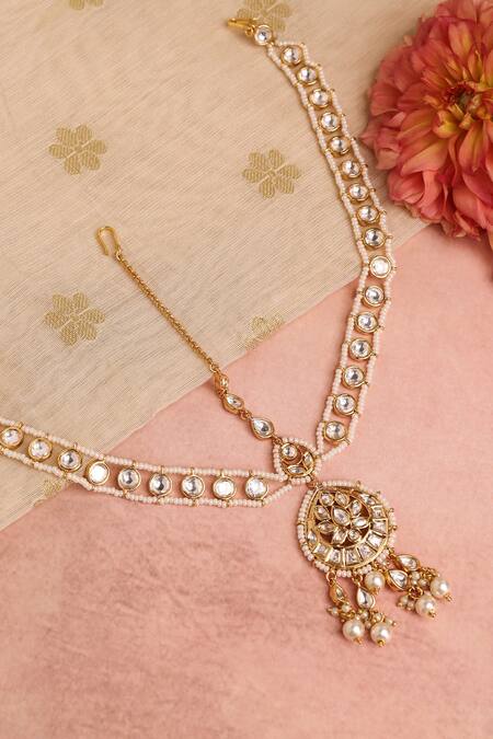 Kundan lotus bloom motif, Pearl drop embellishments, Intricate chain design