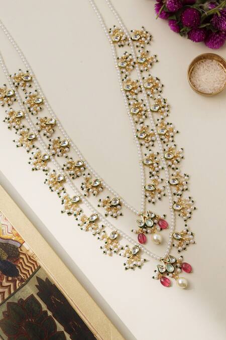 22k gold plating with intricate stonework, Adjustable dori for a secure fit, Multiple layers with pearl drop accents