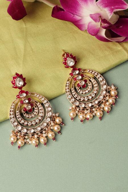 Gold Plated Stones, Pearls, Beads Rippling Lotus Polki Chandbali Earrings