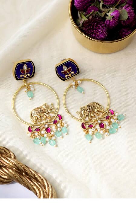 Gold chandbali earrings featuring a carved tusker motif with kundan, bead, and pearl embellishments