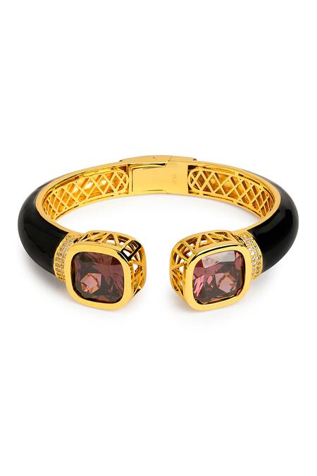 Deep wine-colored cubic zirconia accents, Black enamel finish, Intricate brass design with cutwork detailing