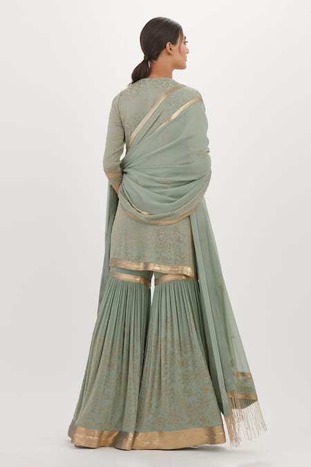 Green kurta featuring a keyhole neckline and long sleeves with floral cutdana work. Paired with an embroidered sharara and dupatta, both adorned with intricate detailing.