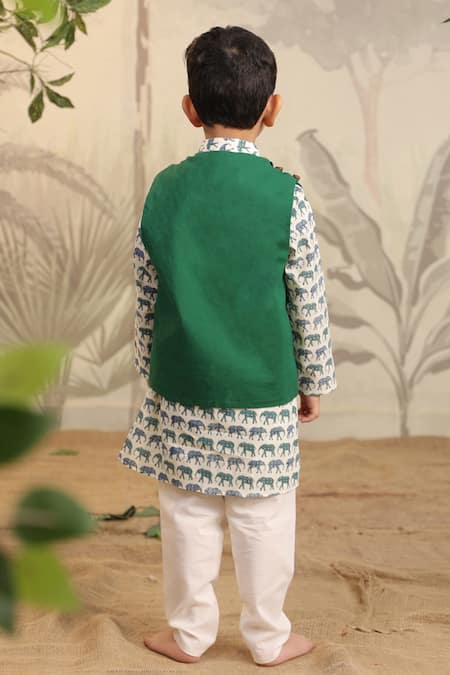 Green jacket featuring elephant block prints. Paired with a printed kurta and churidar.