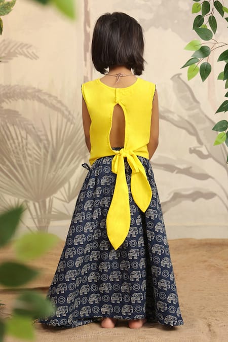 Yellow top featuring sequin and thread embroidery with an elephant motif. Paired with a contrast printed skirt adorned with tassel details and an elasticated waist.