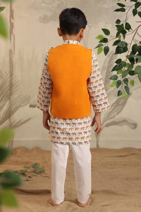 Orange Cotton Printed Elephant Jacket With Kurta Set
