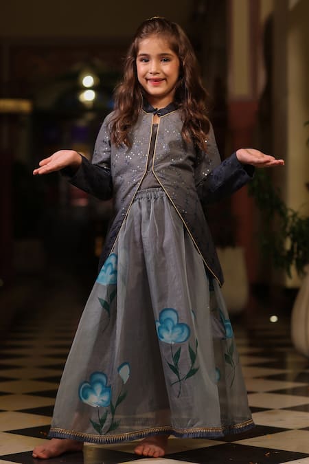 Cute Couture_Grey Organza Sequins, Embroidery Jacket And Lehenga Set _Online_at_Aza_Fashions