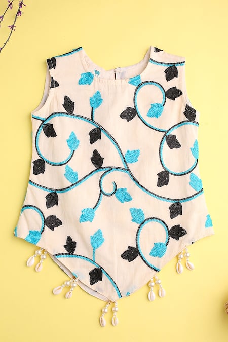 Beige top featuring blue and black leaf vine thread embroidery with tasseled asymmetric hem. Paired with a turquoise blue dhoti pant.