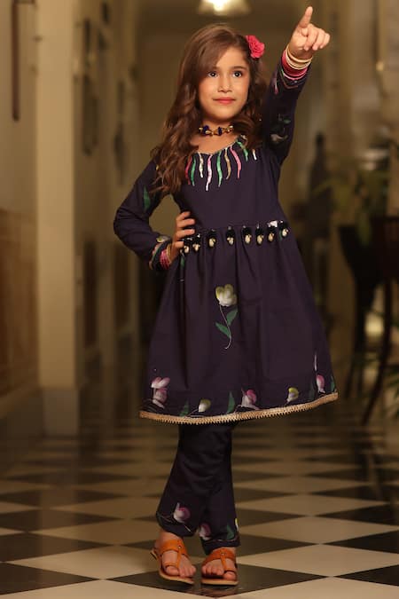 Navy blue kurta featuring floral print and sequins work. Paired with matching pants.