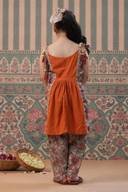 Grey and orange sleeveless floral schiffli embroidered tunic featuring tie-up detailing with bell tassels. Paired with floral print cowl dhoti pant.