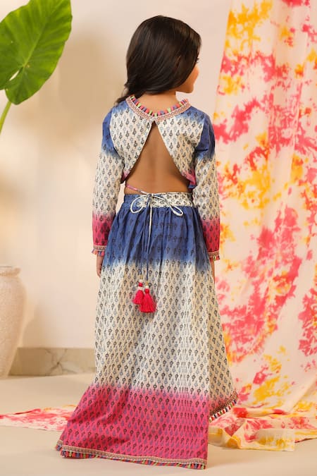 Backless tie-up choli design, Multi colored lace details, Asymmetric hem cut skirt