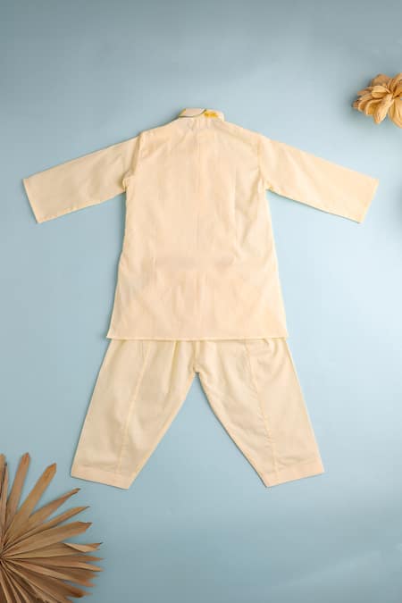 Beige kurta featuring lime yellow and green leaf vine embroidery. Paired with matching yellow pant for a complete look.