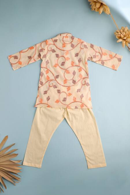 Beige kurta featuring peach and grey leaf vine embroidery. Paired with matching pant in a soft cotton fabric.