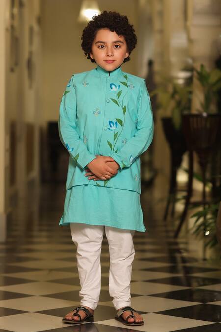 Turquoise blue bundi featuring floral painted and embroidered details. Paired with a matching kurta and pant.