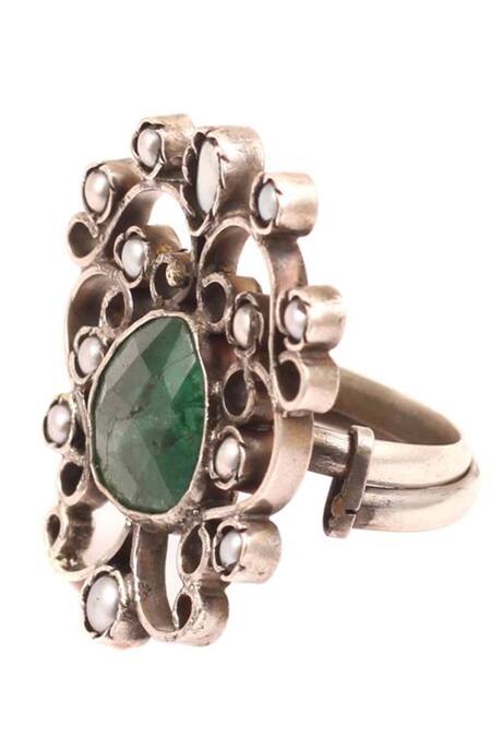 Intricate cutwork design, Adjustable band for size flexibility, Encrusted with green stones
