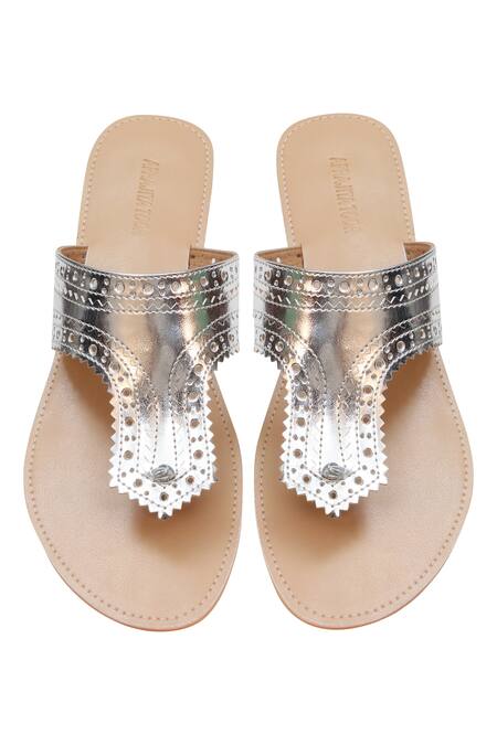 Beige & silver flat sandals with perforated T-strap texture & stack heels.