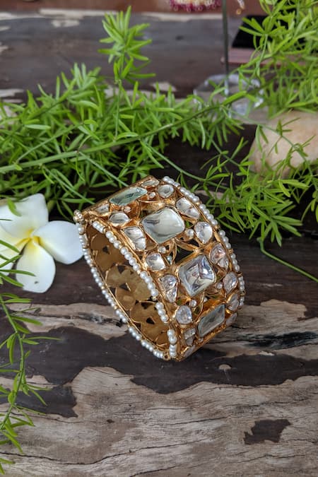 Gold bangle featuring intricate cutwork detail, encrusted with geometric motif stones and embellished beads