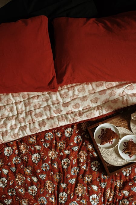 Buy_Raamae_Red 100% Cotton Hand Block Print Dahlia Quilt_at_Aza_Fashions